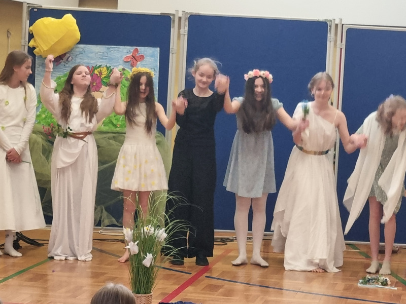 Z okazji pierwszego dnia wiosny - uczniowie kl. 5a przygotowali spektakl pt. "Demeter i Kora". Persefona - grecka bogini wiosny olśniła i dała zapowiedź…