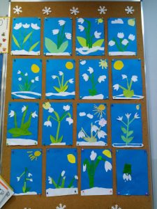 Świetliczaki z 1a poczuły Wiosnę. Pierwsze jej oznaki – przepiękne przebiśniegi, pojawiły się na świetlicowej tablicy.