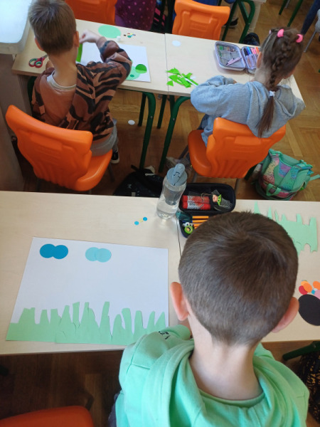 Uczniowie klasy 1a wykonali w parach prace plastyczne, wykorzystując kółka origami. Powstały kolorowe, pełne kwiatów i mieszkańców łąki obrazy.